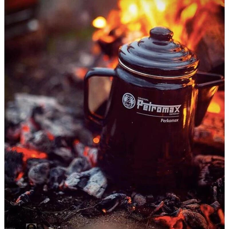 Le Perkomax de Petromax, un percolateur à café émaillé noir de 1,5L, parfait pour préparer un café riche et plein de corps.